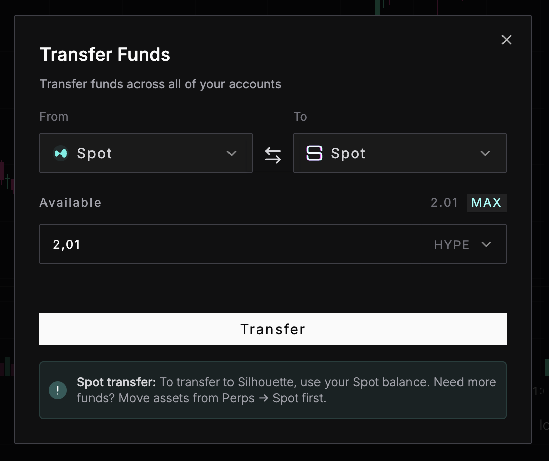 If you have assets on HyperCore, deposit them to Silhouette by clicking To Silhouette in the Accounts Dashboard (when in Naked mode), or by clicking Transfer to/from Silhouette in the Balances section at any time. Your funds are held in a smart contract that only your wallet controls.